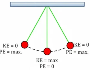As the bob continues toward the opposite extreme point, the kinetic energy again converts back into potential energy. At that point, the potential energy becomes maximum and the kinetic energy becomes zero. This continuous change between PE and KE shows that the total mechanical energy stays constant, which is the law of conservation of energy.